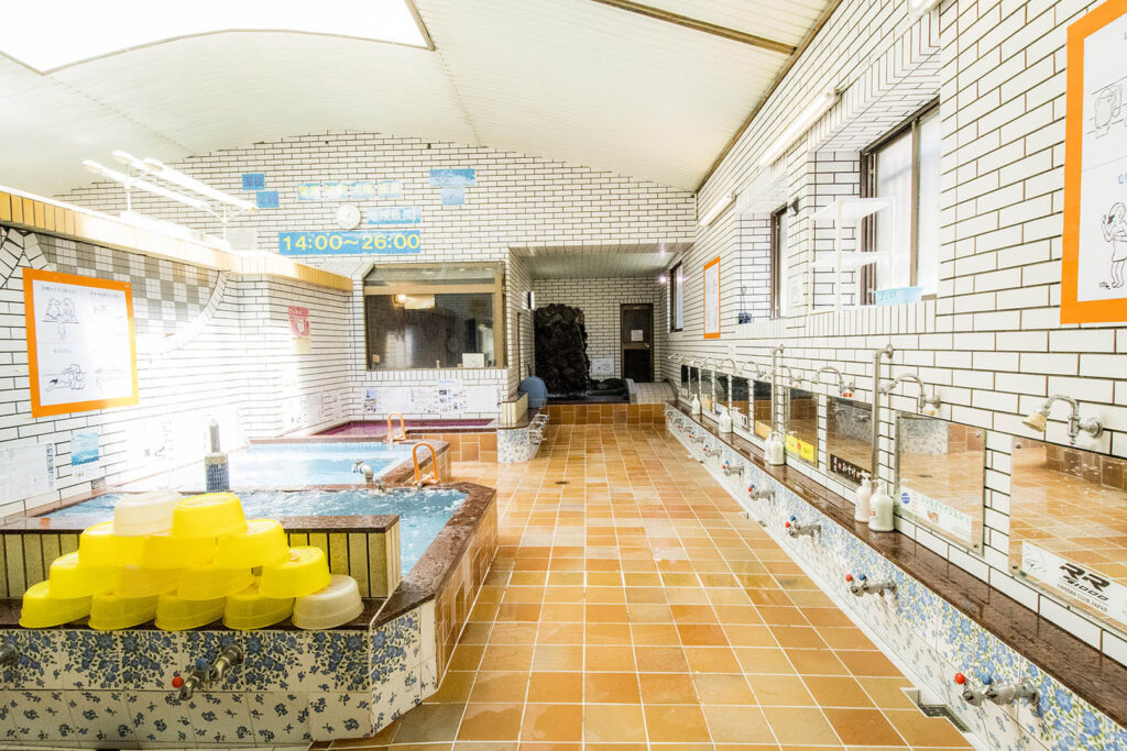 赤・黄・緑のネオン看板が目印のレトロな銭湯建築。
