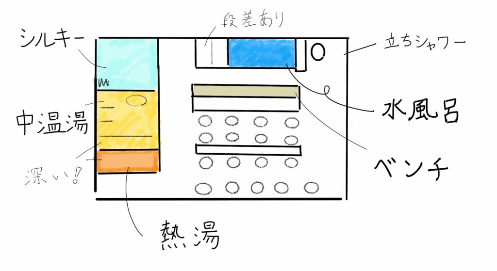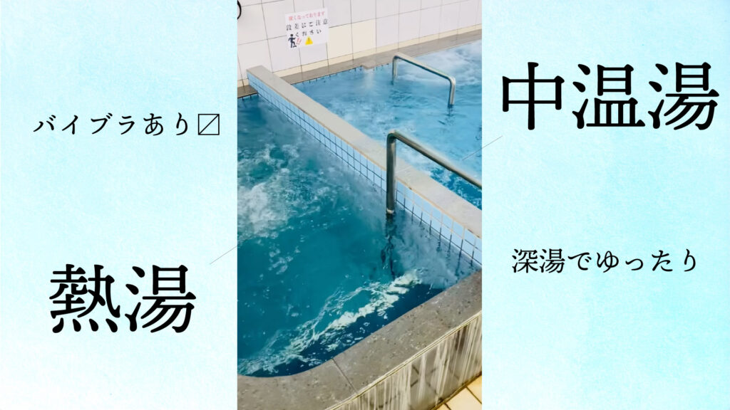 熱湯(バイブラあり)、中温湯(ジェット・バイブラあり)、ぬるま湯(ボタン式のジェット付き)。